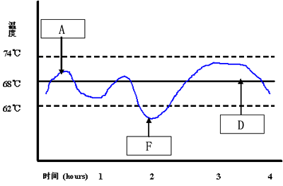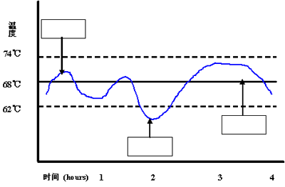 7.下图表明在一定时间内测定食品的加热温度,保证食品安全的最低加热温度是62℃,在图中方框内选择填写相关项目。