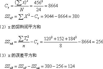 分析结果表明,三种饲料对增重存在极显著的差异,但由于初始体重也差异极显著,我们很难确定,是饲料还是由于初始体重对增重产生的影响,所以,我们必须进行协方差分析,以消除初始体重不同对实验结果的影响,减小实验误差,揭示出处理间真正的差异显著性。