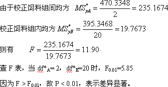 F检验结果表明,通过校正初生重影响后,各饲料间校正平均增重差异极显著,说明三种不同饲料对增重效果确有影响。 |
