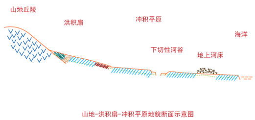 D、如有可能最好能绘制一个山地、洪积扇平原与冲积平原(包括地貌类型)的地貌。如下图:
