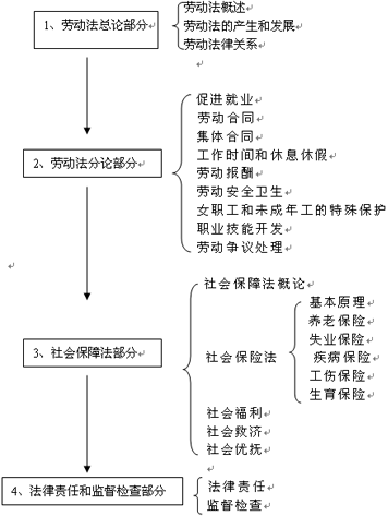 本课程由劳动法和社会保障法2部分内容组成,这2部分法有一定的联系,社会保障法中的社会保险关系是以劳动关系为基础建立的,互有交叉。本课程的学习内容分为四部分: