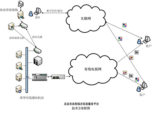 平台采用"播存结构"信息技术,利 用歌华有线线路以及普通PC的方式对 农村共享信息进行传播,对农村信息 资源进行数字化加工和整合,通过有 线电视网络将涵盖文字、图片和音视 频的等内容广泛传播并存储于广大农 村。